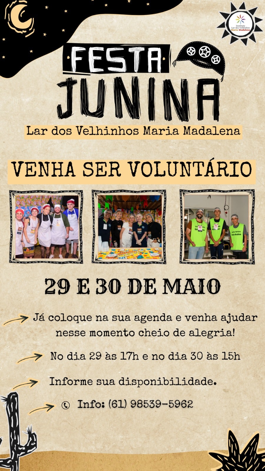 Venha ser voluntário em nossa Festa Junina dias 29 e 30 de maio. Entre em contato no 98539-5962