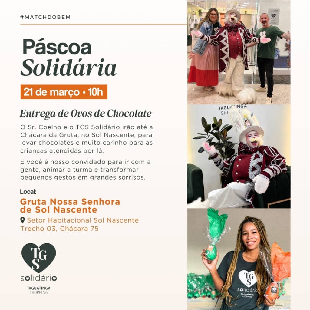No dia 21 de março, às 10h, teremos a nossa Páscoa Solidária, com a entrega de ovos de chocolate para as crianças atendidas na Gruta Nossa Senhora do Sol Nascente, na Chácara da Gruta. Será um momento especial para levarmos não só chocolates, mas também alegria, atenção e muito afeto.